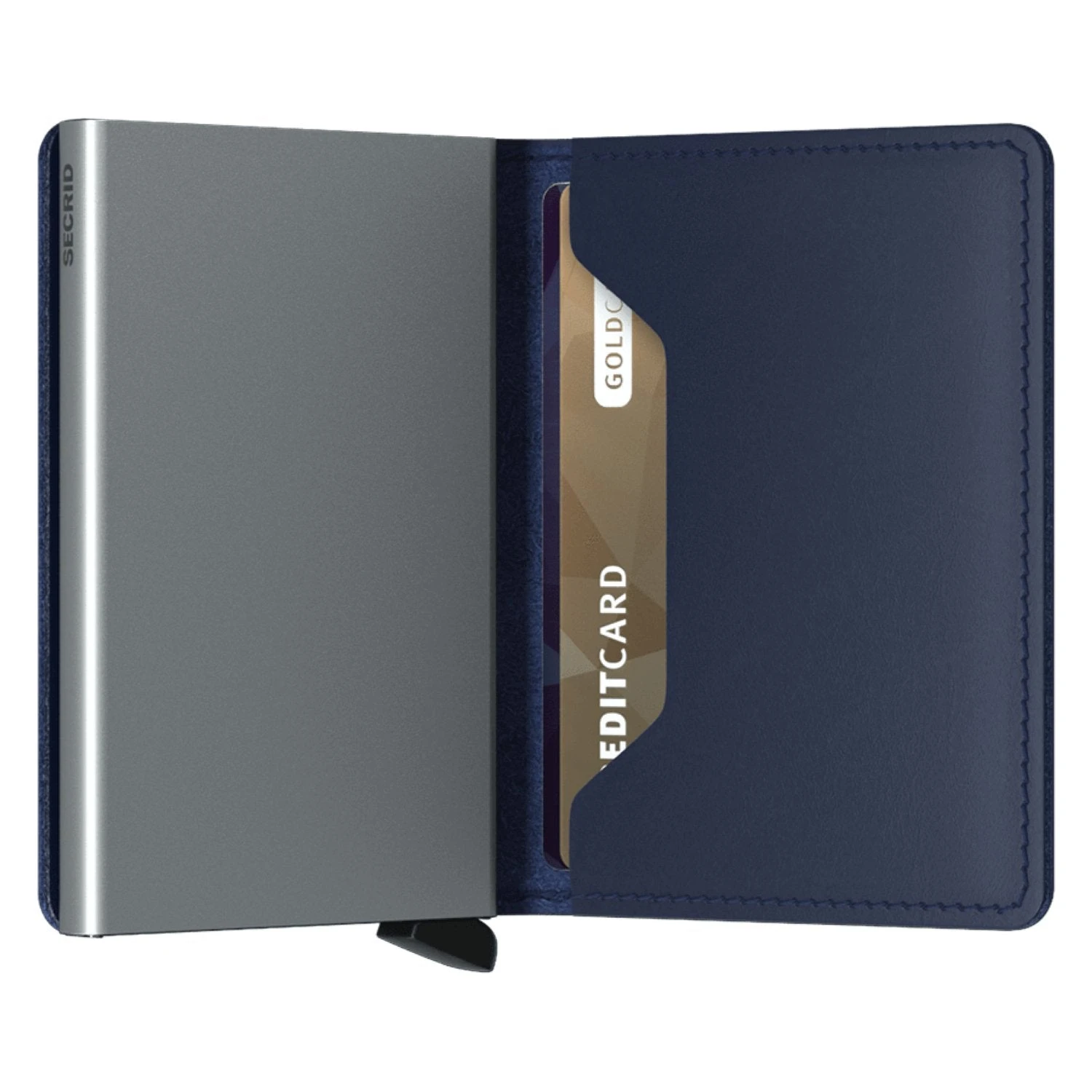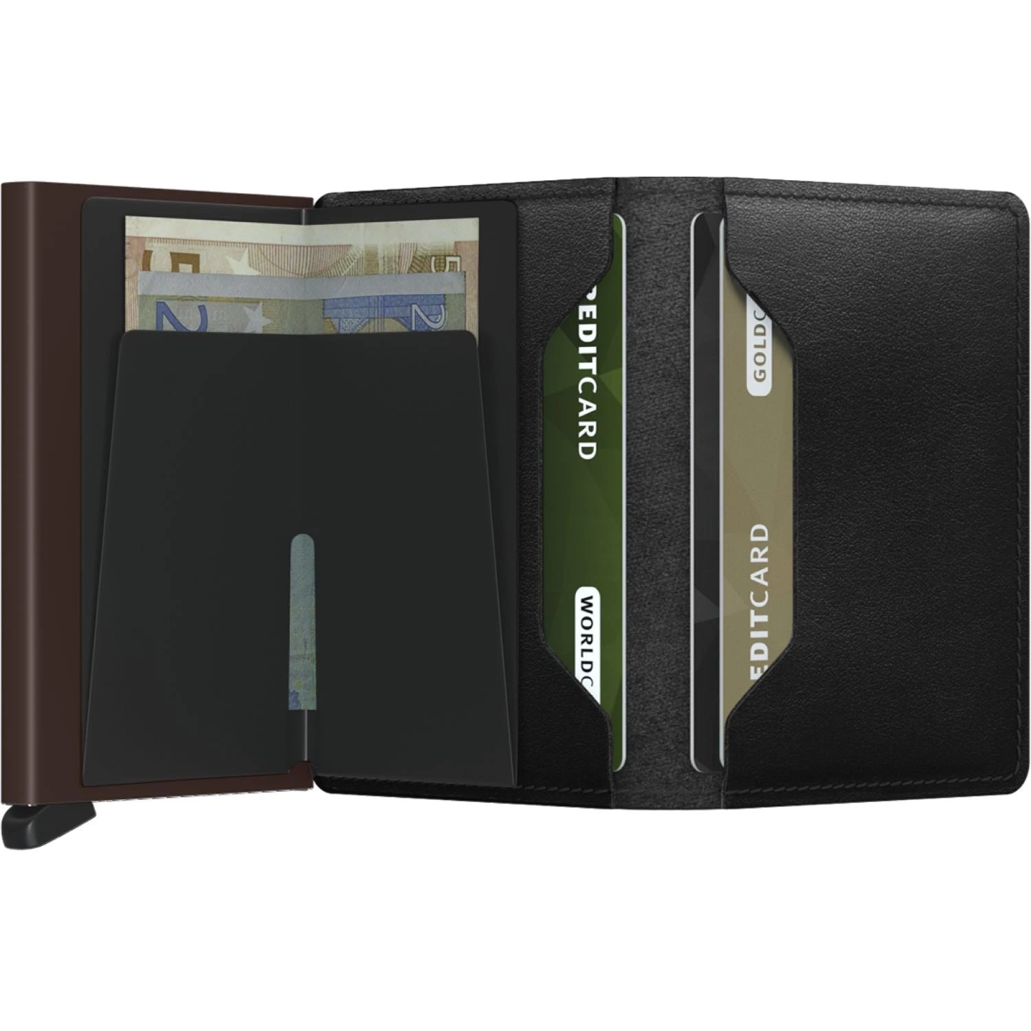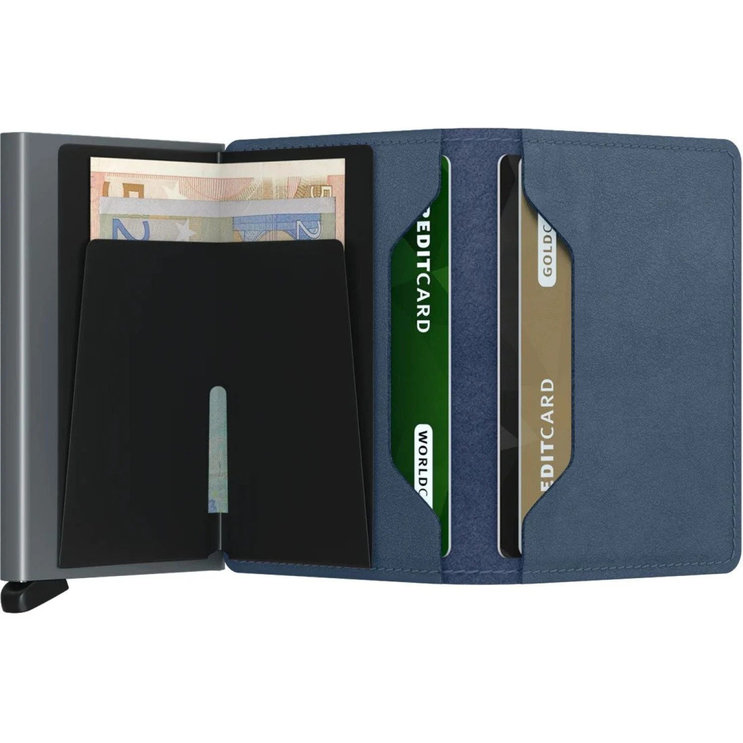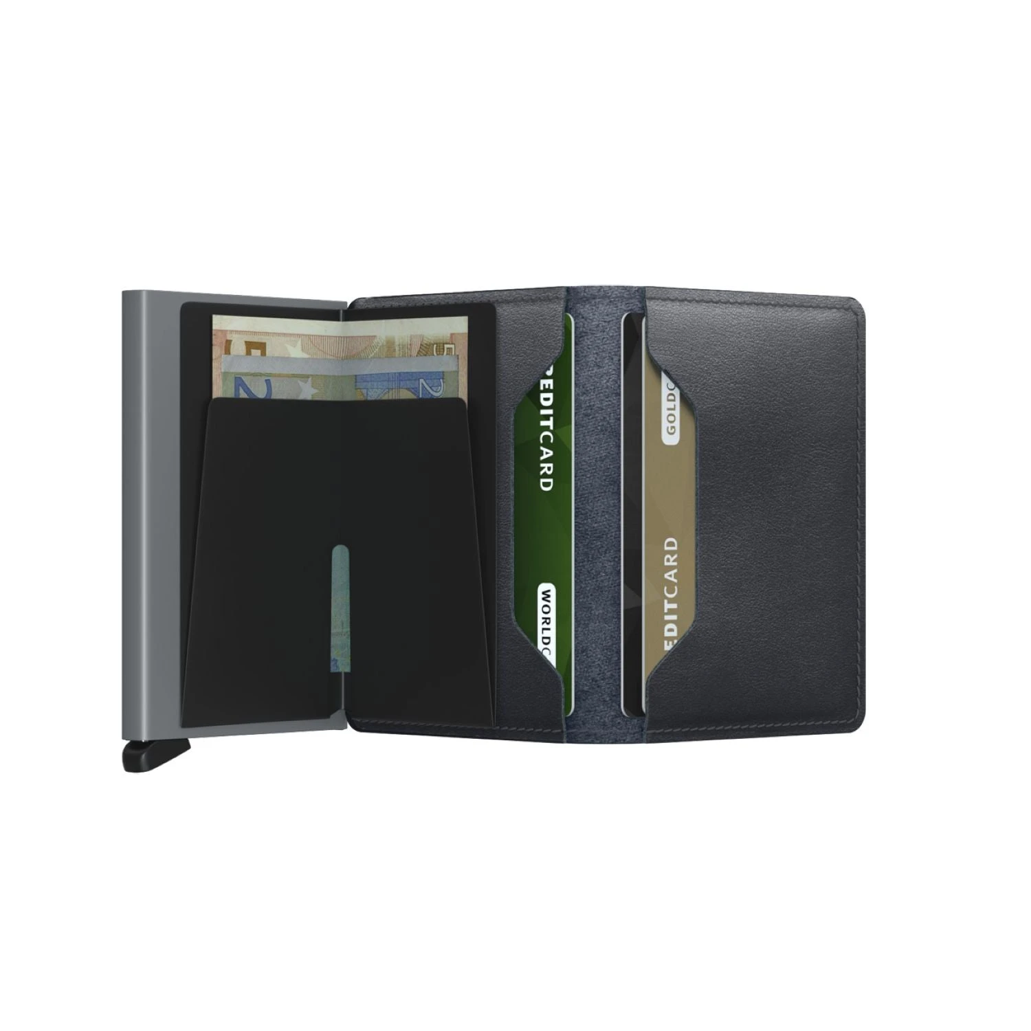 Each Slimwallet has the aluminum Cardprotector inside. The patented mechanism provides a simple and fast access to your cards. Push the lever and the cards slide out smoothly, ready for immediate use. The strong case protects the cards against bending, breaking and unauthorised wireless scanning.